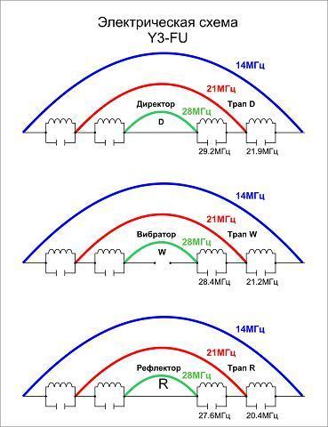 Конструктивно антенна Y3-FU представляет собой два пассивных элемента-директор и рефлектор и один активный вибратор. Последний элемент является разрезным и устанавливается на изоляторах. Его питание обеспечивается через коаксиальный разъём и симметрирующее устройство с трансформацией 1:1. Каждый элемент состоит из внутренней части, трапа и наружной части. Принцип работы антенны основан на свойстве фильтров пробок (трапов) отсекать электрически все проводники,находящиеся на противоположной стороне от нагрузки(генератора).