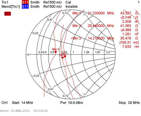 В диапазоне 14 МГц эти участки антенны подключены благодаря катушкам фильтров 21 и 28 МГц, имеющим индуктивный характер. В следствии того,что трапы рефлектора настроены чуть ниже резонансной частоты вибратора,а трапы директора-выше, мы получаем классическую трёхэлементную направленную антенну с резонансными пассивными элементами.