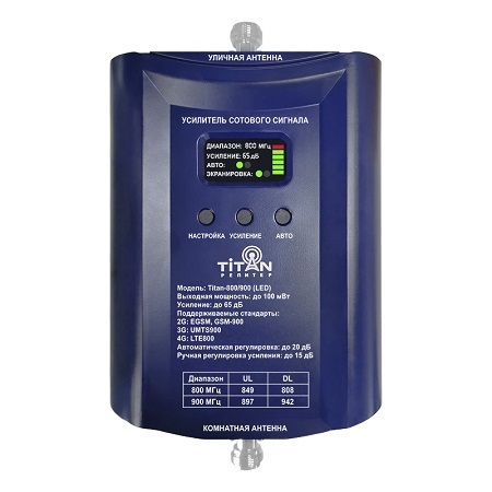 Репитер Titan-800/900 (LED) работает в стандартах связи EGSM/GSM-900 (2G), UMTS900 (3G), LTE800 (4G), обеспечивая в полном объеме голосовую связь и интернет.