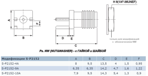 S-P2152, разъем SMA серии, мама (розетка), для монтажа на печатную плату (PCB mount). Конструктив разъема - прямой.