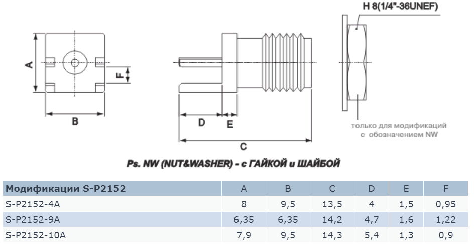 S-P2152-4A, разъем SMA серии, мама (розетка), для монтажа на печатную плату (PCB mount). Конструктив разъема - прямой.